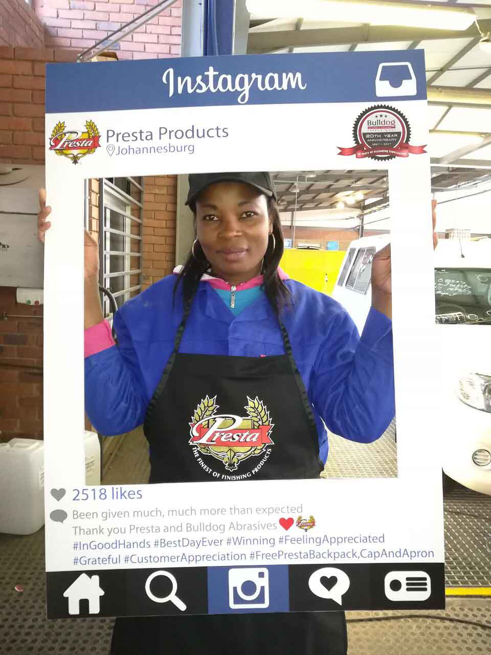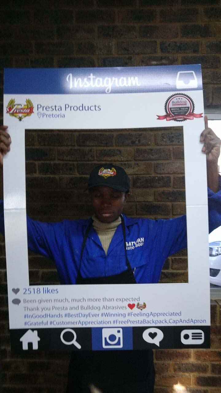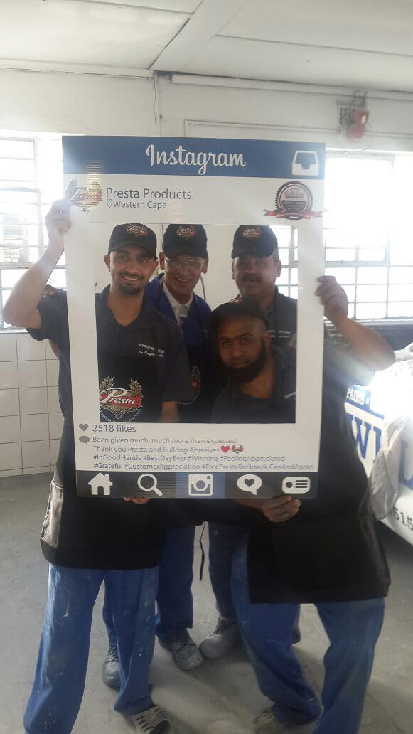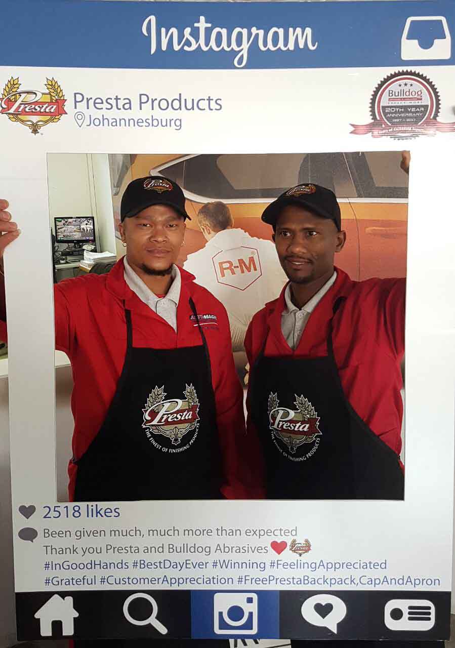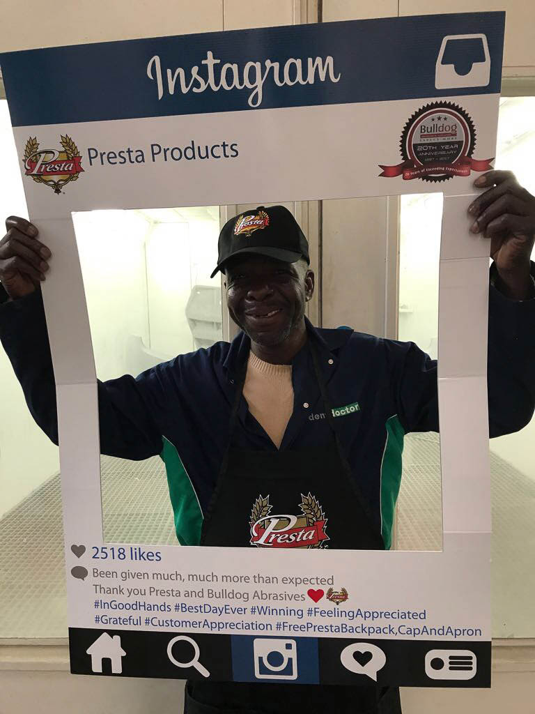 To celebrate the “20-year partnership” between the two companies – Bulldog Abrasives and Presta Products implemented an initiative where Bulldog’s top sales and technical representatives took to the road to personally say “Thank you” to each panel shop who proudly chooses to use Presta Products in their daily polishing processes. They also gave away much appreciated back-packs, caps and aprons to the hard-working polishers who actually use the product in the shops.